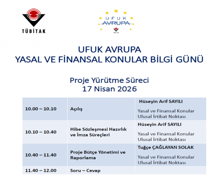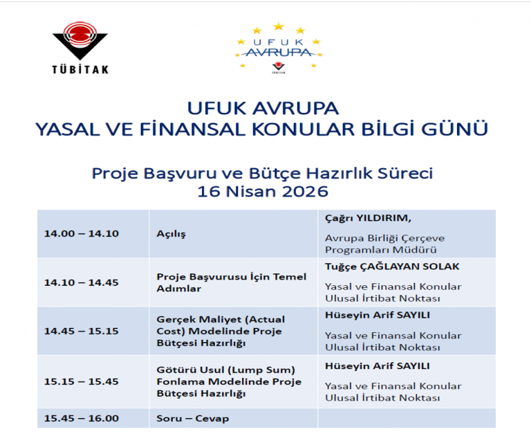 TÜBİTAK tarafından, Ufuk Avrupa Programı kapsamında "Yasal ve Finansal Konular Bilgi Günleri" 16–17 Nisan 2026 tarihlerinde iki oturum halinde çevrim içi olarak gerçekleştirilecektir. Etkinliğin ilk oturumu, 16 Nisan 2026 tarihinde saat 14.00'te başlayacak olup bu oturumda Ufuk Avrupa projelerine yönelik başvuru süreci ve bütçe hazırlama aşamaları ele alınacaktır. 17 Nisan 2026 tarihinde saat 10.00'da gerçekleştirilecek ikinci oturumda ise proje yürütme sürecinde dikkat edilmesi gereken yasal ve finansal hususlar hakkında bilgilendirmeler yapılacaktır.