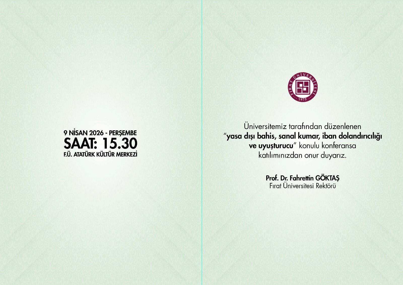 Yasa Dışı Bahis, Sanal Kumar, IBAN Dolandırıcılığı ve Uyuşturucu Konferansı 9 Nisan 2026, Perşembe Saat: 15.30 Yer: Fırat Üniversitesi Atatürk Kültür Merkezi